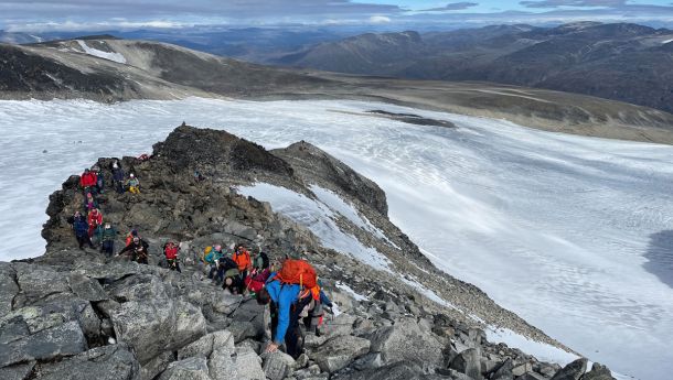 Galdhøpiggen: Tidligere rusmisbrukere guidet svaksynte og blinde på den krevende turen opp til toppen av Norges høyeste fjell. (Foto: Halvor Mykleby)