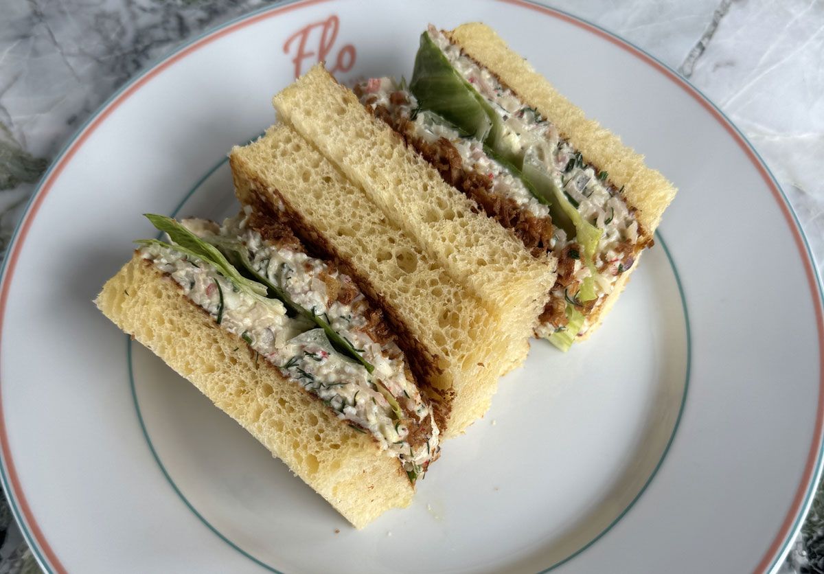 Ta utgangspunkt i to tykke skiver brioche brød (kan kjøpes på Meny) som du fyller med tunfiskrøre og syltet nykål.