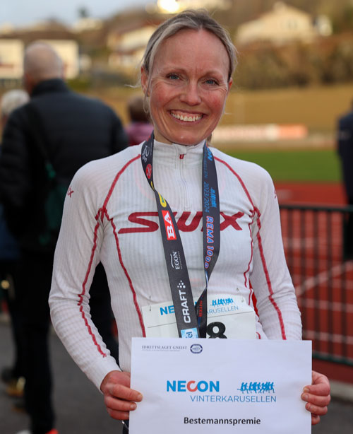 I den sesongen av Necon Vinterkarusell som nettopp er avsluttet, har Renate Galleberg deltatt fire ganger og endt opp med tre seire og en annenplass. I fjor tok hun en andreplass på halvmaraton i Bergen City Marathon og hun vant det krevende motbakkeløpet Kvasshovden Opp i Hardanger. Året før vant hun ultraterrengløpet Styrkeprøven Rett Vest, som er en kraftprøve over åtte fjelltopper med en samlet lengde på 50 km og 3000 høydemetre.