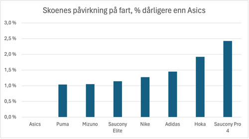 Selv om man med kun tre testpersoner skal være forsiktig med å trekke for bastante konklusjoner, er det interessant at den nye modellen fra Asics skiller seg ut som den beste skoen i årets test, klart foran gruppen bak. I fjor var Hoka Rocket X2, On Cloudboom Echo 3 og Adidas Adizero Adios Pro 3 omtrent på same nivå som testvinneren fra Saucony Endorphin Elite. I år er det lite som skiller fjorårsvinneren fra Puma Fast-R Nitro Elite 2, Mizuno Wave Rebellion Pro 2, Nike Vaporfly 3 og Adidas Takumi Sen 10. Derimot viser testen at Hoka Cielo X1 og Saucony Endorphin Pro 2 gir merkbart dårligere løpsøkonomi sammenlignet med de øvrige modellene.