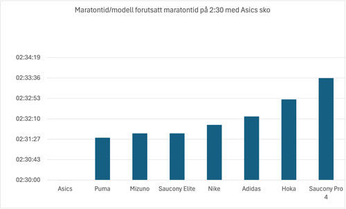 Som tidligere beskrevet er forskerne enige om at en forbedring i løpsøkonomien bedrer farten med 0,65-0,85 %, dvs. i snitt 0,75 %. For å illustrere hvordan bruk av de forskjellige skoene vil påvirke løpstiden, kan vi ta utgangspunkt i en person som løper maraton på 2:30 (150 minutter) i testvinneren Asics Endorphin Sky Paris. Dersom den samme personen hadde løpt med Saucony Endorphin Pro 4, som kom dårligst ut i denne testen, ville hen teoretisk sett ha løpt 3 minutter og 36 sekunder saktere (150 x 0,032 x 0,75), dvs. på 2:33:36. For mange ville en slik forbedring på dette nivået være vanskelig å oppnå kun gjennom trening. Det skal sies at forskjellen mellom beste og dårligste sko i fjorårets test var enda større (4 minutter og 39 sekunder). Med tanke på at fjorårsvinneren Saucony Endorphin Elite var et stykke bak Asics Metaspeed Sky Paris i årets test, og at forskjellen mellom beste og dårligste sko allikevel er mindre enn i fjor, er det nærliggende å tro at forskjellene mellom superskoene er mindre nå enn noen gang tidligere (merk at den mye omtalte Adidas Adizero Adios Pro Evo 1 ikke er med i denne testen).