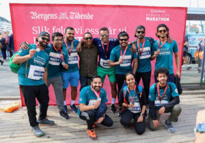 Foran en av selfieveggene treffer vi en gjeng som stiller opp til et lagbilde. De kommer fra Bergen Malayali Association. De har deltatt med et stafettlag og skal nå ha et lagbilde i de rette omgivelser på Bryggen. En av dem forklarer Kondis hvem de er: