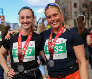 I målområdet treffer vi på Ingrid Dahle og Mathea Walskaar, som begge er entusiastiske og tydelig fulle av endorfiner etter at de begge har klart å fullføre sin første halvmaraton.