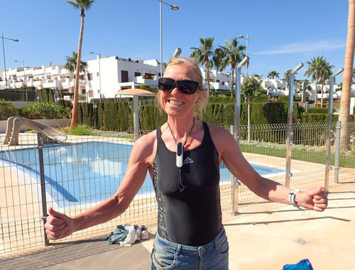 – Jeg har noen ganger forsøkt meg på gruppetimer på treningssenteret der jeg bor, men har måttet gi opp fordi instruktørene ikke forklarer godt nok hvordan øvelsene skal gjøres. Når noen for eksempel sier at vi skal strekke ut armene, trenger jeg å vite hvor jeg skal strekke dem. Det er ganske vesentlig om jeg skal strekke dem framover, oppover eller ut til siden, ler Åsne som er godt fornøyd med forklaringene fra instruktørene i Spania.