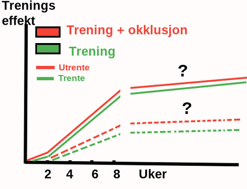 En studie, figur 1, (2) viste fremgang i både løpsprestasjon, kraft i quadriceps og hamstringsstyrke etter 8 uker med 3 økter i uken med okklusjon.