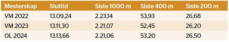 I OL-løpet hadde han en marginalt raskere siste 1000 meter, mens den siste hele og halve runden gikk litt seinere enn i fjor. Avslutningen var likevel sterkere enn i VM-løpet i Eugene i 2022.
