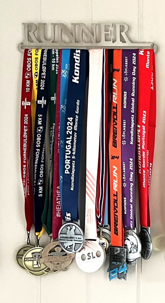 Vis frem medaljene – ikke legg dem i en skuff, skriver Løpeskjørt på sine nettsider. De har gitt oss en medaljehenger med plass til fra åtte til ti medaljer.