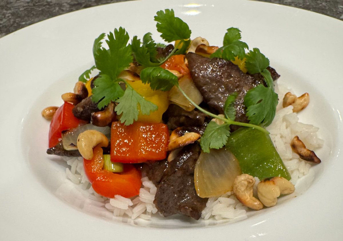 500 gram ytrefilet av okse 1 dl soyasaus ½ ts svart pepper 1 ts bakepulver 1 ss potetmel 1 grønn paprika 1 rød paprika 1 gul paprika 1 løk 100 gram cashewnøtter Koriander Halv lime 3 dl Jasmin-ris