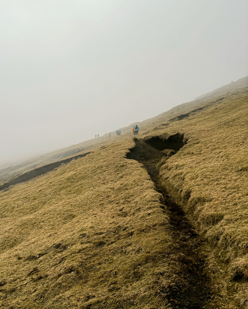 Reportasjemessig kunne turen virke mislykket – ingen fantastisk utsikt, bare tåke. Og viten om at det bak tåketeppet ser helt nydelig ut. Men i realiteten var det et ekte møte med hva løping på Færøyene innebærer.