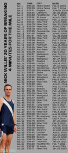Før årets sesong la Nick Willis opp sin profesjonelle satsing som løper, men han har ikke tenkt å slutte å løpe. Tanken på å klare 20 strake år med mileløp under 4 minutter har også motivert han til å trene: