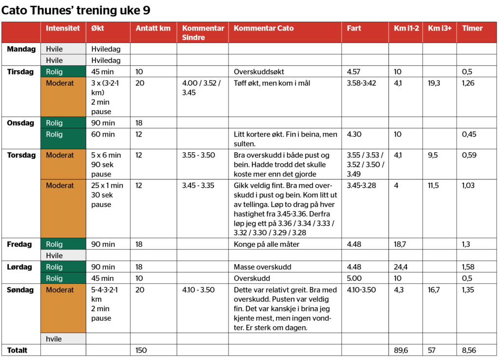 Sindre forteller at de 15 milene Cato løper i uka, gjøres med en fast fridag. Både langturer og intervalløkter har godt volum, og øktene kan for eksempel bestå av 4 x 5 km eller 3 serier på 3 – 2 – 1 km. Han har også løpt 60 minutter progressivt på mølla med snitt under 4 minutter på kilometeren.