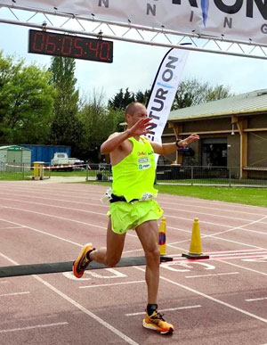 Løpet gikk på en 400-metersbane i Bedford i Storbritannia, og tida gir en gjennomsnittlig km-tid på 3.39 per km. Altså ti 10-kilometre på 36.34 på rad uten pause. 42,2 km ble passert på 2.32.33 og 50 km på 3.01.50.