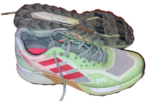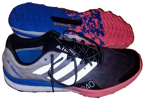 Adidas Terrex Agravatic Ultra er en relativt tung sko for de lange turene. Dette er Adidas første terrengsko med en karbonplate og sålen er like stiv som den er stabil. Mens Adidas sine asfaltsko med karbonsåle er laget for fart, er Agravatic Ultra laget for stabilitet. Overdelen er svært stabil, og den øvre delen er så stiv at mange får vondt i anklene de første turene før skoene er «løpt inn». Hælkappen går også høyt opp og er stiv, så de med akillesproblemer kan fort få problemer med disse skoene. Fordelen er at skoene sitter godt på foten til tross for bred passform. Overdelen er laget i et slitesterkt materiale som både puster og drenerer godt. Tåboksen er nokså romslig, og det er en god tåbeskyttelse i front. Sålen har flere lag. Nærmest foten og mest i bakre delen av skoen er det et mykt og responsivt Boost-materiale, noe som gjør at skoen oppleves som nokså kontant og hard dersom man lander på forfoten. Så et lag med Light Strike-materiale som gir stabilitet. Så en karbonplate som går under hele sålens lengde. Yttersålen i Continental gummiblanding med 4 mm knotter gir meget godt grep, også på våte steiner og røtter. Dessverre er det flere hulrom i sålen hvor steiner kan sette seg. Oppsummert er Adidas Terrex Agravatic Ultra en svært stabil sko som er laget for å gi maksimal stabilitet og beskyttelse i lange løp i høyalpint terreng. Dessverre er prisen for dette at den kan oppleves som litt tung og klumpete, men for de som søker maks stabilitet og beskyttelse kan dette være et godt valg.