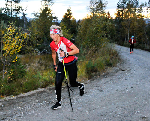 – Elghufs er fine greier. Og særlig på en sånn kveld som dette. Se den himmelen! Dette er jo helt fantastisk, sier hun og smiler på en måte som etterlater ingen tvil om at den spreke 69-åringen trives i fjellvegen denne fine høstdagen, mens ei lav sol sender dagens siste soltråler over gjengen som hufser opp og løper ned bakken. En bakke som nok en mandagskveld er arena for gjengen som trener midt i elgens rike på Spillum utenfor Namsos.