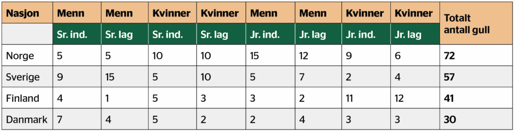 Etter 25 år med nordiske mesterskap i terrengløp har Norge tatt klart flest gullmedaljer. Særlig i kvinner senior og menn junior har norske løpere dominert, men av en eller annen grunn har ikke den norske dominansen i juniorklassen for menn gitt utslag i like mange gull i seniorklassen. Det blir spennende å se om noen av de som sørga for firedobbelt norsk i menn junior i år, klarer å følge opp med seniormedaljer i framtida.