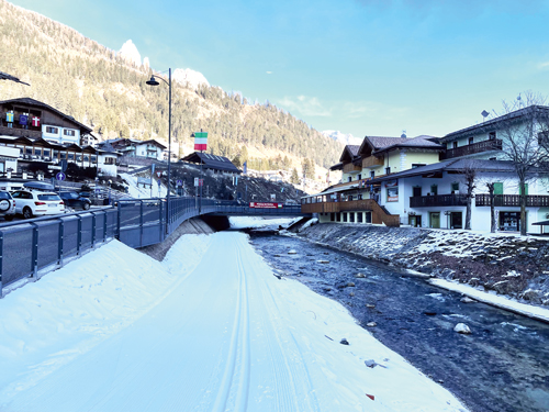 Hele tiden går vi langs elven og ser de høye vakre hvite fjellene rundt, i alle fall hvis en løfter hodet litt. Av og til stiger vi opp i høyden og får enda mer utsikt – og en lang utforbakke etterpå. Høyeste bakken er rett før Moena hvor en da får stor fart tvers gjennom byen. Hvis en vrir hodet litt til venstre et stykke etter Moena får en øye på de to store hoppbakkene som ble brukt under VM for noen år siden.