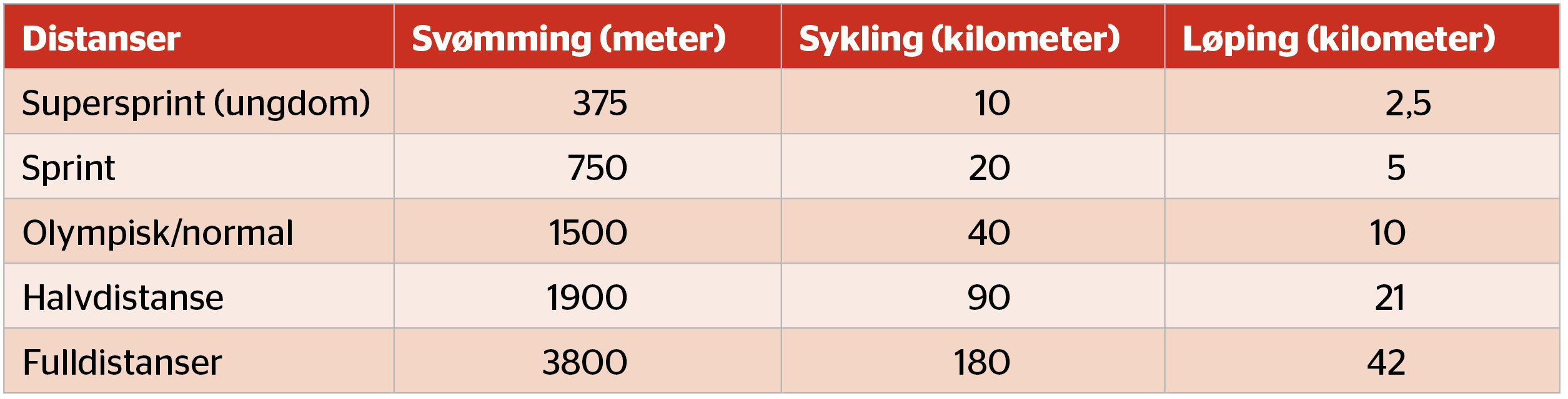 Som for mange andre idretter finnes det ulike distanser (se tabell 1). For voksne heter de korteste «sprint» og de lengste «langdistanse». Sprint betyr ikke at du behøver å gjøre det ekstremt fort; det henspeiler til lengden på distansen.