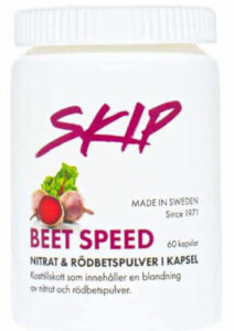 Skip Beet Speed består av rødbetepulver, som er naturlig rik på nitrat. I tillegg har produktet ekstra tilsatt nitrat. Produktet selges i kapselform.