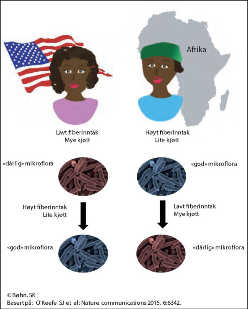 Flere studier har vist en sammenheng mellom ulike kostholdsmønstre og bakterieflora. Den lave generasjonstiden gjør at bakterier skiftes ut raskt, så kostomlegging kan føre til tilpasninger i mikrofloraen på kort tid. En klinisk studie som undersøkte effektene av å bytte kostholdet mellom en afrikansk populasjon (mye fiber, lite kjøtt) og en afro-amerikansk populasjon (lite fiber, mye kjøtt) fant at etter bare to uker hadde man påvirket sammensetningen av mikrofloraen (se Figur 1 på side 32).
