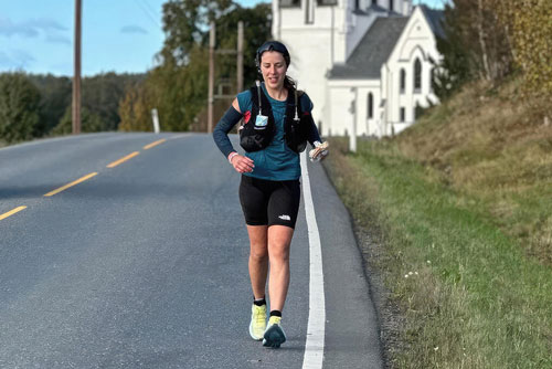 – Dette var gøy, sa Miriam etter å ha løpt de 14 milene fra Oslo til Halden forrige helg. Det kom noen bølgedaler på veien, men positive tanker og et par airpods gjorde susen. (Foto: Privat)