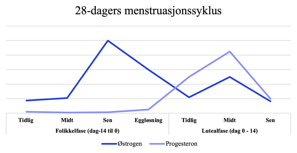 For å forstå hvorfor kvinner og menn kan respondere ulikt på trening og ha ulike næringsbehov, er det både lurt og nødvendig å ha kjennskap til menstruasjonssyklusen (se figur 1). Under syklusen har vi to dominerende hormoner: østrogen og progesteron. Noen av østrogenets effekter er at det beskytter mot beinskjørhet og insulinresistens, demper appetitten og påvirker hvor fett lagres på kroppen (hofte og lår fremfor magepartiet). Progesteron på sin side fører til økt nedbrytning av aminosyrer og redusert proteinsyntese, økt metabolisme (forbrenning) samtidig som det påvirker elektrolyttbalansen og forbruket av karbohydrater.