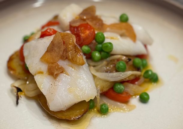 (4 personer) 800 g poteter 2 løk 100 g kokte grønne erter 200 g sherrytomater 600 g torsk eller annen hvit fisk 1 dl olivenolje
