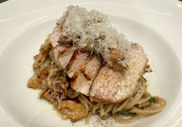 Fullkorn spaghettini med kantareller og kyllingbryst