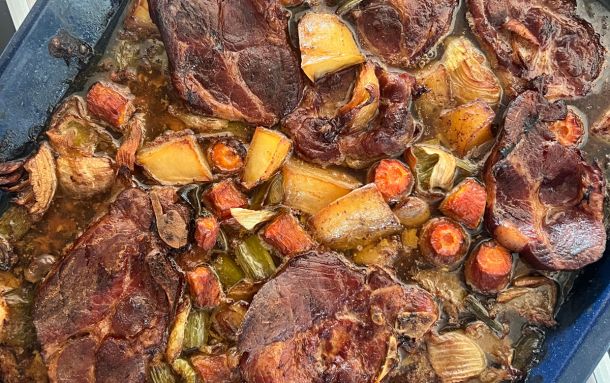 Fordel kjøtt og grønnsaker i en langpanne, spe med all vesken og sett det i ovnen på 180 grader i 20 min…