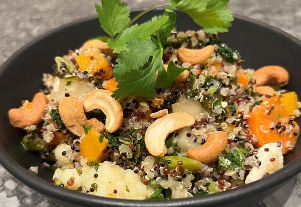 Quinoasalat med bakte grønnsaker er en sunn og frisk salat som metter. Den står seg godt i kjøleskapet. Du kan gjerne doble oppskriften så kan den nytes i flere dager.