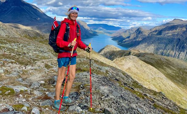 Dag 12: Mona Kjeldsberg nyter panoramautsikten fra Skaidimassivet mot Pitshusjaervi.