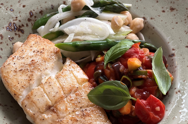 Kveite er den beste fisken jeg kan tenke meg. På grunn av den milde smaken utfyller den perfekte aromaen til tomatragu, agurk og fennikel som jeg her har valgt som tilbehør. Nå er det sesong, og du finner kveita i de fleste fiskedisker.